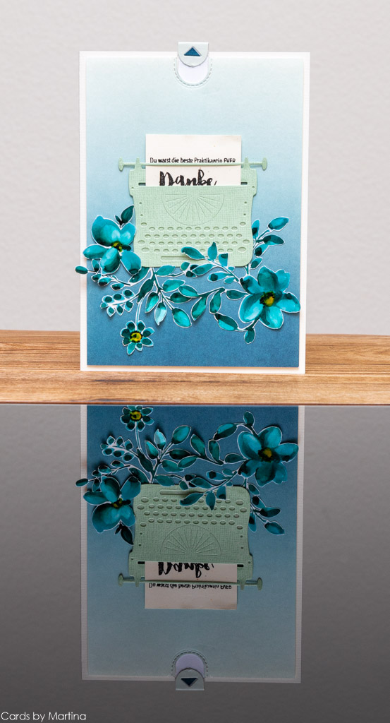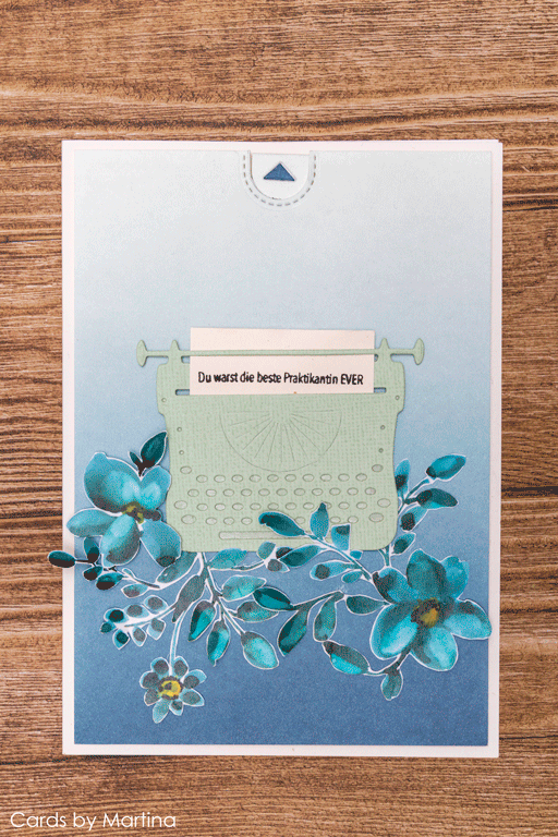 Das in die Schreibmaschine eingespannte Papier bestempelte ich mit Klartextstempeln von Dani Peuss. Den ersten Schriftzug „Du warst die beste Praktikantin EVER“ brachte ich so an, dass es aussieht, als wäre er mit der Schreibmaschine geschrieben worden. Den zweiten Schriftzug „Danke für die tolle Zeit“ brachte ich so an, dass er hinter der Schreibmaschine versteckt ist und erst sichtbar wird, wenn man am Pull-Tab zieht.