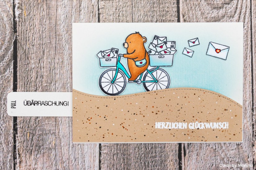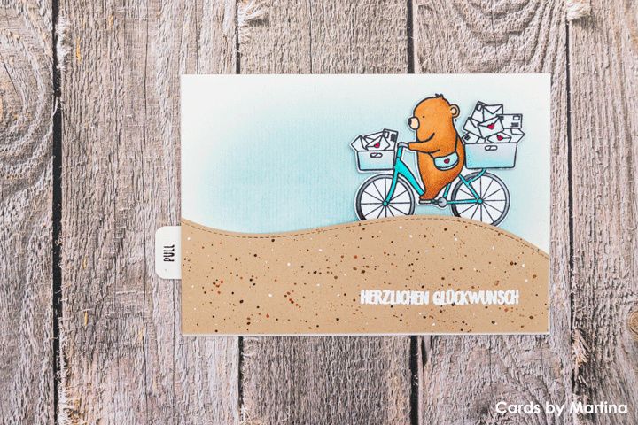 Das „Bärmail“-Stempelset von Create a Smile war perfekt für dieses Vorhaben. Zuerst habe ich den Bären auf dem Fahrrad und die Briefe mit Memento Tuxedo Black gestempelt, dann mit Copic Ciao-Stiften koloriert und schliesslich von Hand ausgeschnitten. Danach habe ich die Hügellandschaft aus braunem Papier ausgestanzt und mit verschiedenen Distress Inks für ein wenig Struktur gesorgt. Auf die Hügellandschaft habe ich mit Versamark die passenden Geburtstagswünsche gestempelt und mit weissem Embossinpulver fixiert, auf das Pulltab habe ich die passende „Übärraschung“ gestemptelt. Auch den blauen Himmel erstellte ich mit Distress Ink. Die sichtbaren Teile der Karte waren damit bereit. Nun ging es an die ganzen unsichtbaren Mechanismen.