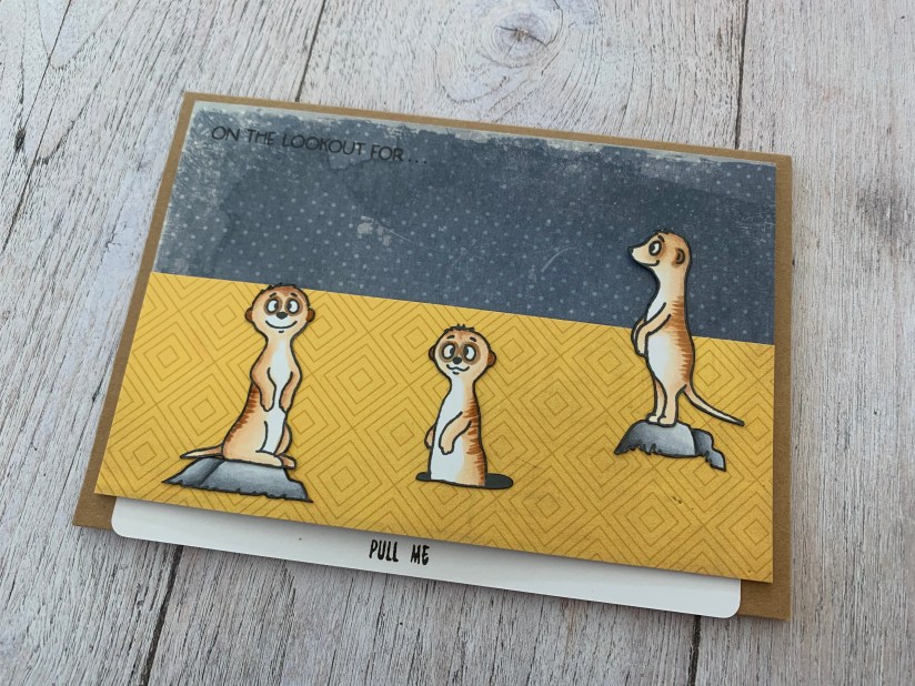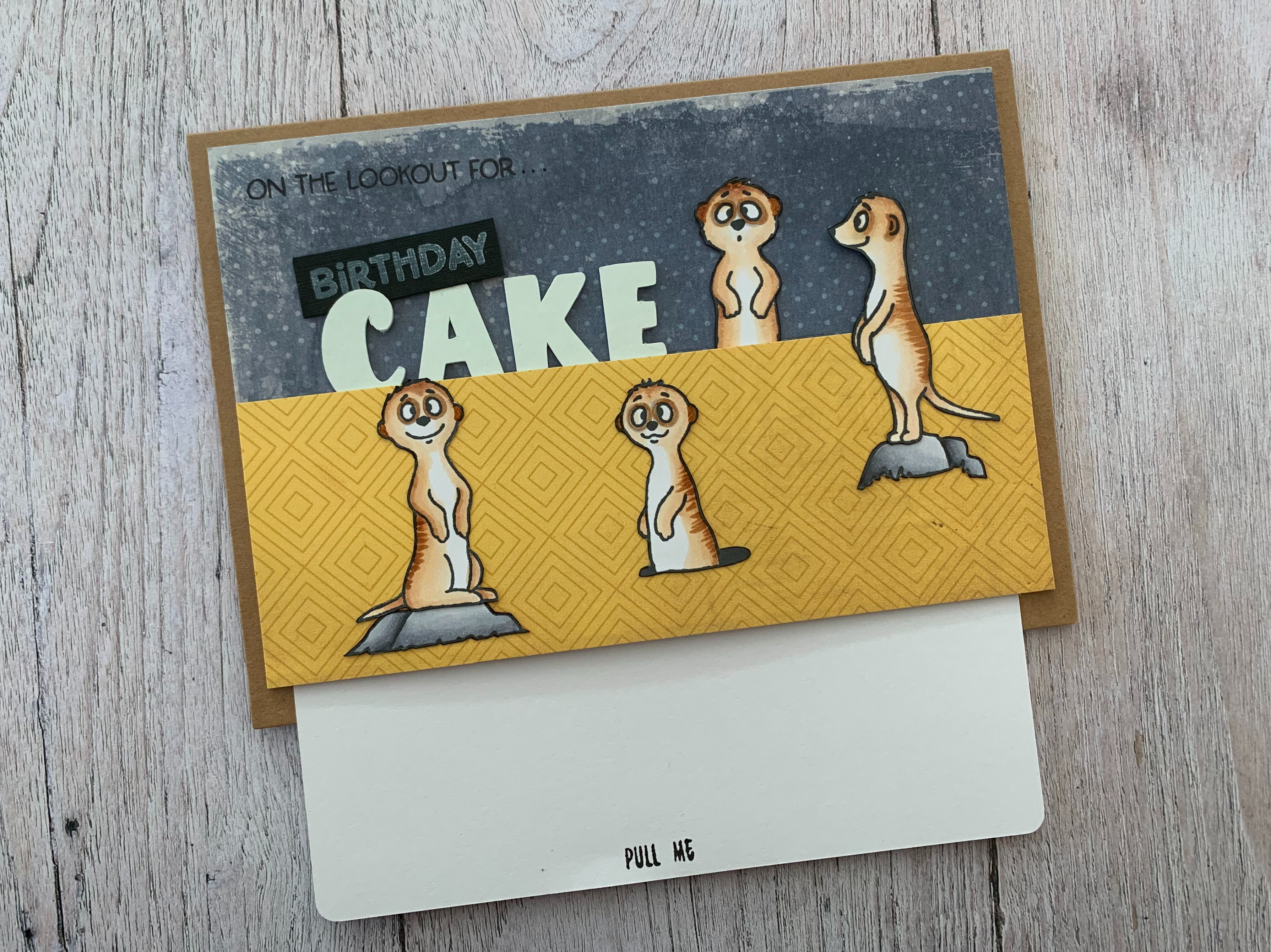 Das Highlight der Karte ist der interaktive Mechanismus, deshalb habe ich darauf verzichtet, zu viele Details einzubauen. Und die lustigen Erdmännchen brauchen eigentlich nicht viel mehr Dekoration. Die Buchstaben für den „Cake“-Schriftzug sowie die Pulltab-Karte habe ich mit meinem Plotter ausgeschnitten. Die Inspiration für den interaktiven Mechanismus stammt von Laura Dovalo.
